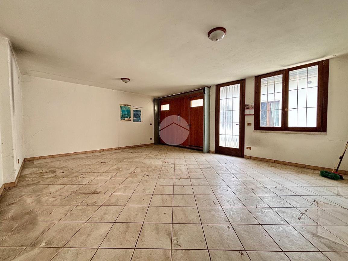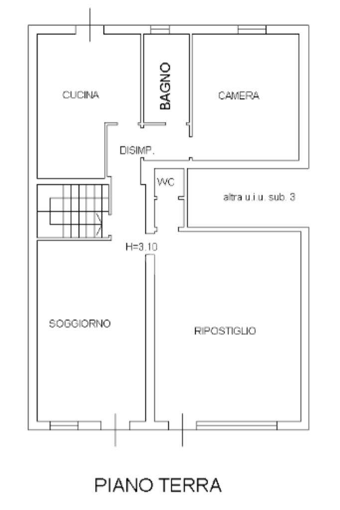 L’immobile si sviluppa interamente al piano terra ed è caratterizzato da ingresso indipendente con accesso diretto al soggiorno. Da qui, tramite una porta interna, si accede a un ulteriore locale attualmente accatastato come ripostiglio, ma originariamente adibito a negozio, come testimoniano l’ampia vetrata e la porta d’ingresso ancora presenti; a seguito di cambio di destinazione d’uso, questo spazio è oggi parte integrante dell’abitazione. All’interno di questa zona si trova anche un bagno cieco di servizio.