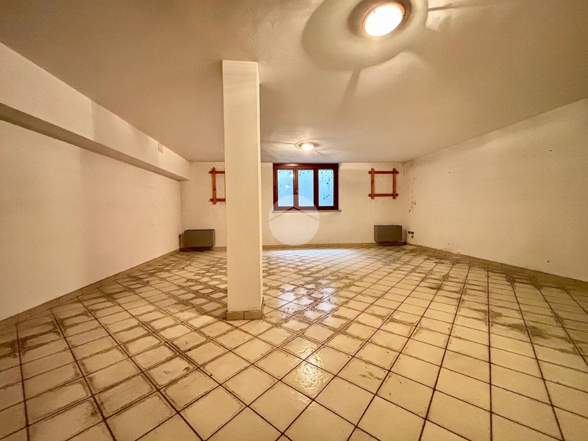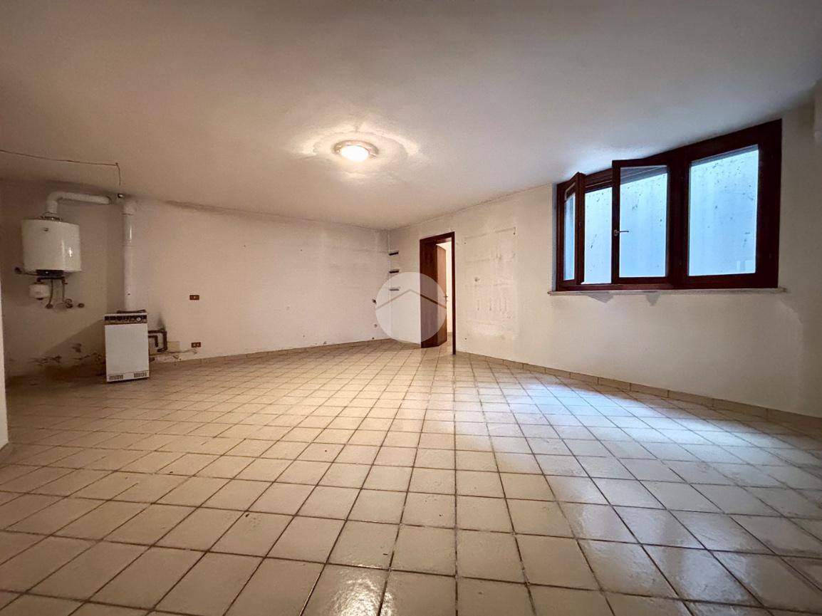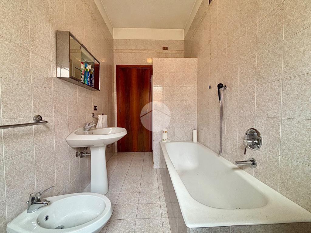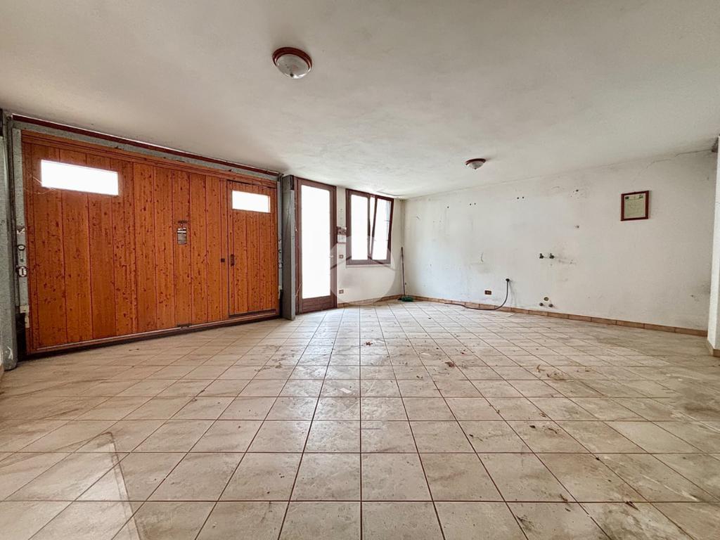 Proseguendo lungo il corridoio si accede alla cucina abitabile, dalla quale si raggiunge una corte esterna dove sono collocati i garage, tra cui quello di proprietà, di generose dimensioni. Sempre lungo il corridoio si trovano un bagno finestrato dotato di vasca e una camera matrimoniale. Una porta presente nel disimpegno conduce inoltre a una scala interna che porta al piano seminterrato, dove si sviluppano una taverna e ulteriori locali ad uso cantina.