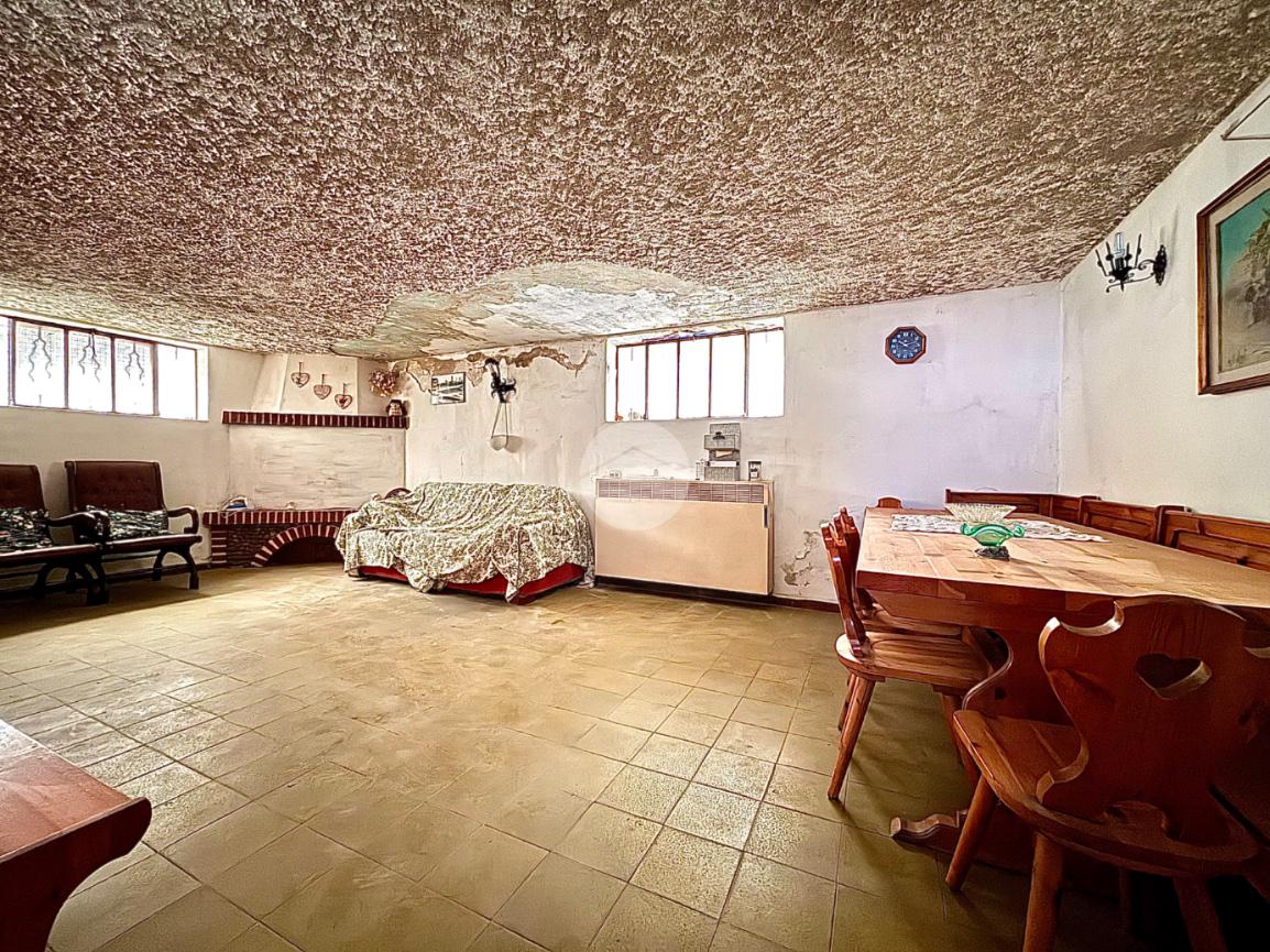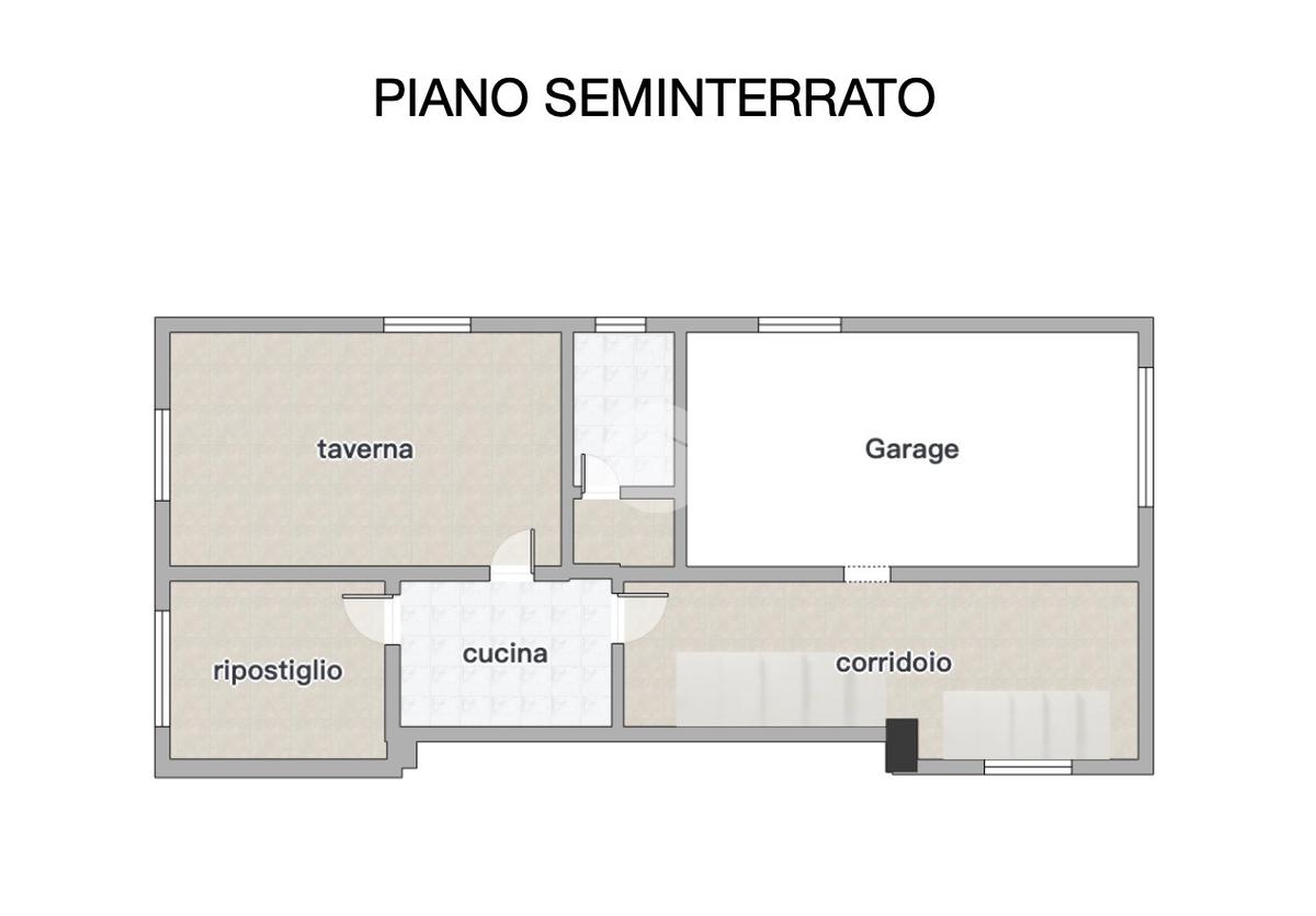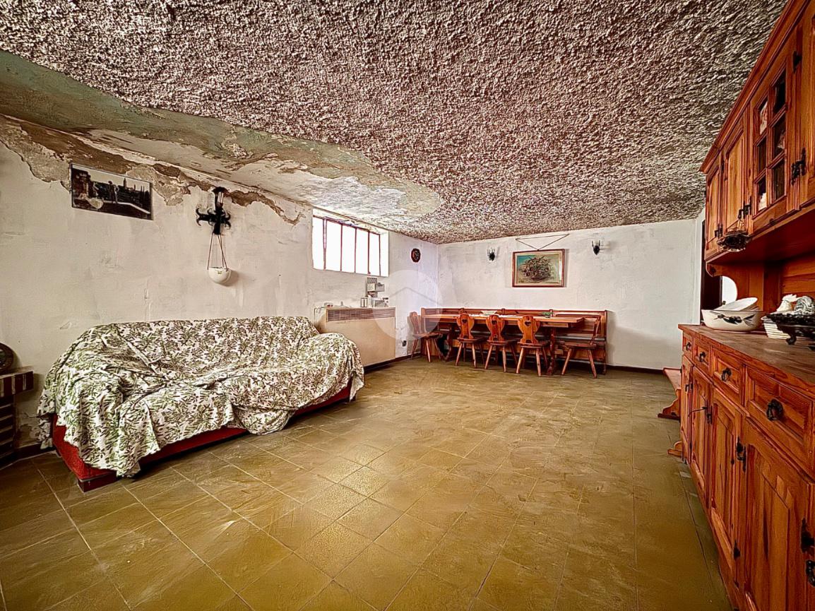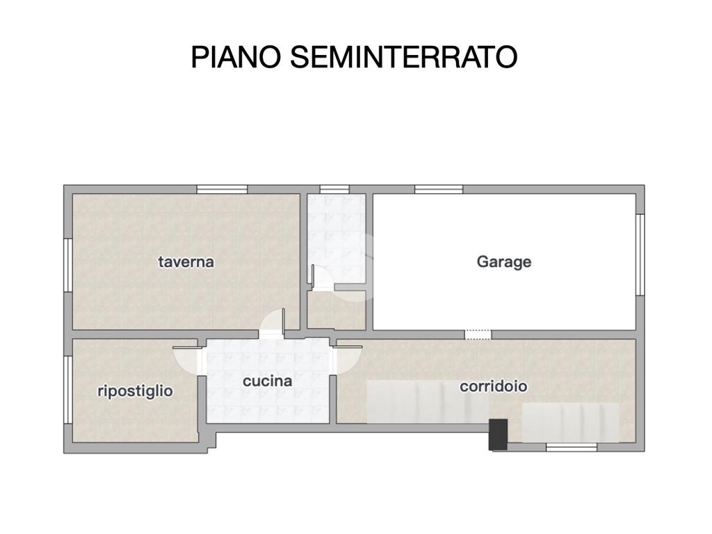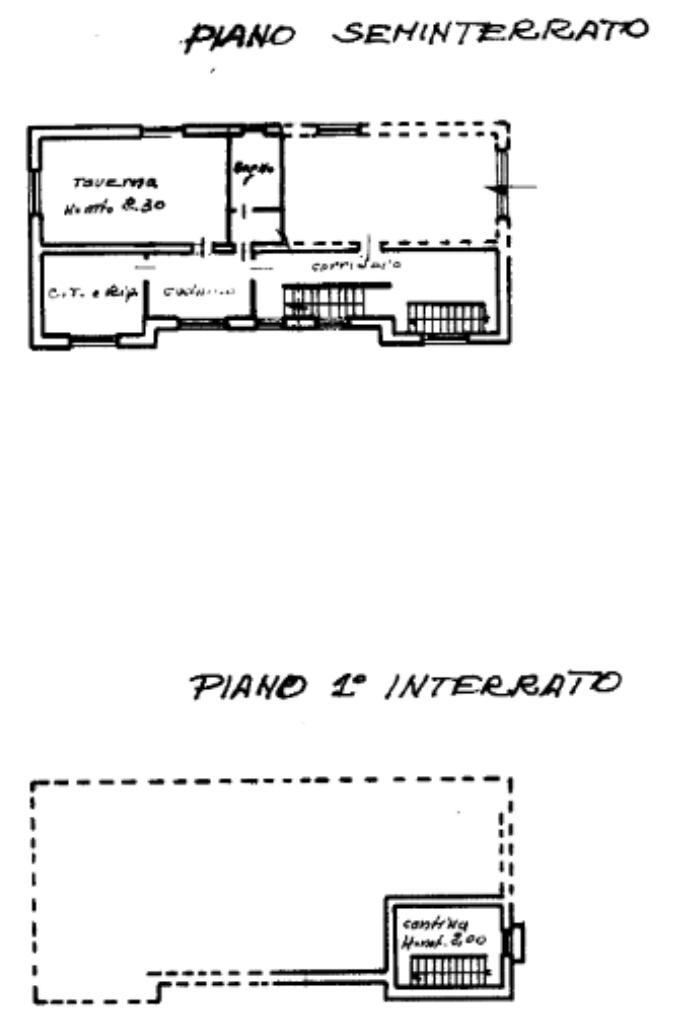 Dal medesimo disimpegno si accede al piano seminterrato, dove troviamo diversi locali accessori: taverna, cucinotto, locale cantina attualmente adibito a camera, secondo bagno con doccia, garage doppio, oltre a una zona di disbrigocon ulteriori scale che conducono alla cantina vera e propria.